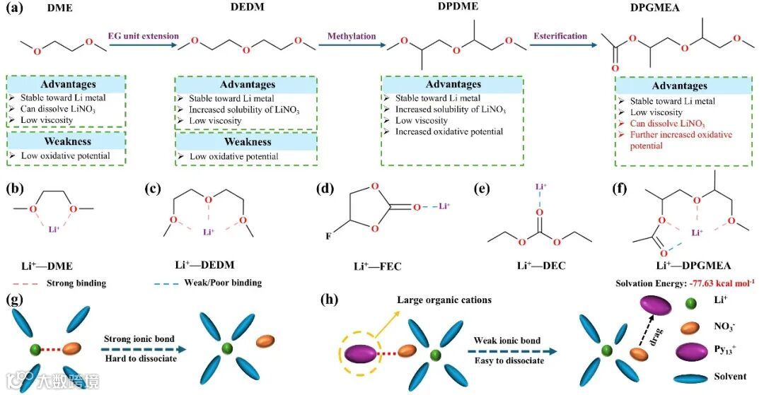 Figure 2. a) Design of solvent molecules to enhance the electrochemical performance of electrolytes. The revealed coordination between Li ion and different solvent molecules: b) DME; c) DEDM; d) FEC; e) DEC; f) DPGMEA. g) Schematically illustration of dissolution processes of LiNO3 in organic electrolytes. h) Schematically illustration of dissolution process of Py13NO3 ionic liquid in organic electrolytes.