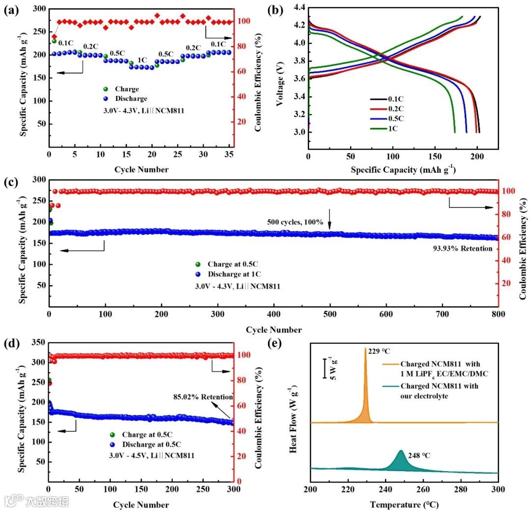 Figure 5. Electrochemical performance and safety assessment of Li metal cell. a) Rate performance of Li||NCM811 cells. b) Charge/discharge profiles from selected cycles within 3.0–4.3 V. c) Long-term cycling performance of Li||NCM811 cells operated at 0.5 C charge/1 C discharge within 3.0–4.3 V. d) Cycling performance of Li||NCM811 cells operated at 0.5 C within 3.0–4.5 V. e) DSC curves of fully charged NCM811 with different electrolytes.