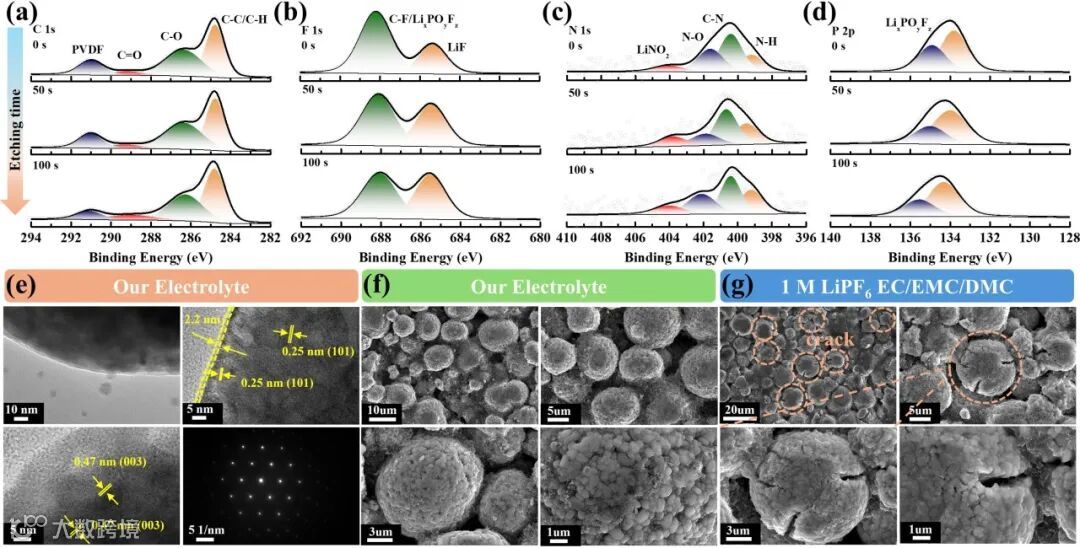 Figure 4. Characterization of NCM811 cathode in our electrolytes and 1 m LiPF6 EC/EMC/DMC electrolyte. In depth XPS spectra of the NCM811 cathode in our electrolyte: a) C 1s; b) F 1s; c) N 1s; d) P 2p; e) HRTEM and SAED characterization of NCM811 cathode in our electrolyte after 100 cycles; SEM images for the surface of NCM811 cathodes after 100 cycles at 1 C in (e) our electrolyte; f) 1 M LiPF6 EC/EMC/DMC electrolyte.