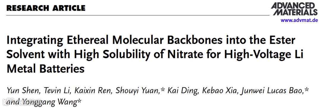 基于此,来自昆明理工大学锂离子电池及材料制备技术国家地方联合工程中心袁守怡,联合美国波士顿学院Junwei Lucas Bao课题组、复旦大学王永刚课题组在国际知名期刊Advanced materials上发表了一篇名为“Integrating Ethereal Molecular Backbones into the Ester Solvent with High Solubility of Nitrate for High-Voltage Li Metal Batteries”的文章。该文章提出了一种用大尺寸有机阳离子取代Li+来降低LiNO3晶格能和在酯类溶剂中引入醚分子骨架提高溶剂化能的策略,极大地提高了硝酸盐在酯类溶剂中的溶解度。最终将N-丙基-N-甲基吡咯烷硝酸盐离子液体(Py13NO3)和二丙二醇甲醚醋酸酯(DPGMEA)成功用于高压锂金属电池体系。得益于这一优化设计,在目标电解液中实现了高的初始库伦效率(95.18%)以及稳定的Li+沉积;另外,Ah级的Li||NCM811软包电池在超过150次循环后仍然有89.5%的高容量保持率。本研究为设计适用于高压锂金属电池的酯类电解液提供了新的思路。