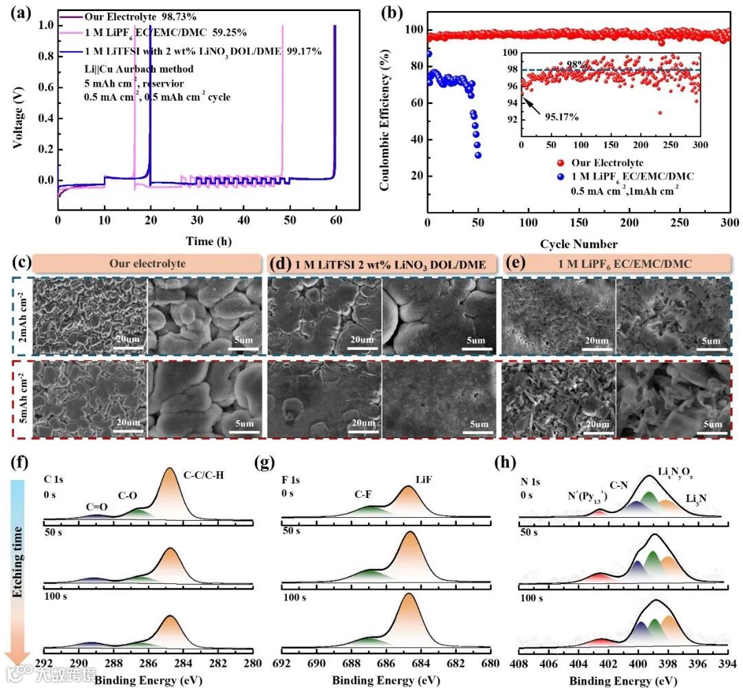 Figure 3. Characterization of Li metal anode in different electrolytes. a) Long-term Li plating/stripping average CE test performed with deposition capacity of 0.5 mAh cm−2 at 0.5 mA cm−2. b) Cycling performances of Li||Cu half cells in different electrolytes with deposition capacity of 1.0 mAh cm−2 at 0.5 mA cm−2. Morphologies of Li deposition at 0.5 mA cm−2 in c) our electrolyte. d) 1 M LiTFSI 2 wt% LiNO3 DOL/DME electrolyte. e) 1 M LiPF6 EC/EMC/DMC electrolyte. In-depth XPS spectra in our electrolyte of f) C ls, g) F ls, h) N ls.