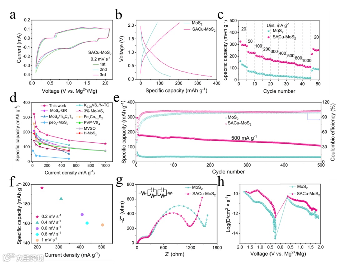 图 3(a)SACu-MoS2在扫描速率0.2 mV s-1下的CV曲线;(b)SACu-MoS2在电流密度为20 mA g-1、工作电压范围为0.1–2.1 V(相对于Mg2+/Mg)下的第二圈恒电流充放电曲线;(c)SACu-MoS2在20–1000 mA g-1不同电流密度下的倍率性能;(d)SACu-MoS2与其他已报道的基于过渡金属硫化物可充镁电池正极材料的倍率性能对比;(e)SACu-MoS2与MoS2在500 mA g-1下的循环性能;(f)通过对不同扫描速率下的CV曲线积分电流所得的SACu-MoS2的放电容量;(g)SACu-MoS2与MoS2的电化学阻抗谱;(h)SACu-MoS2的Mg2+扩散系数。