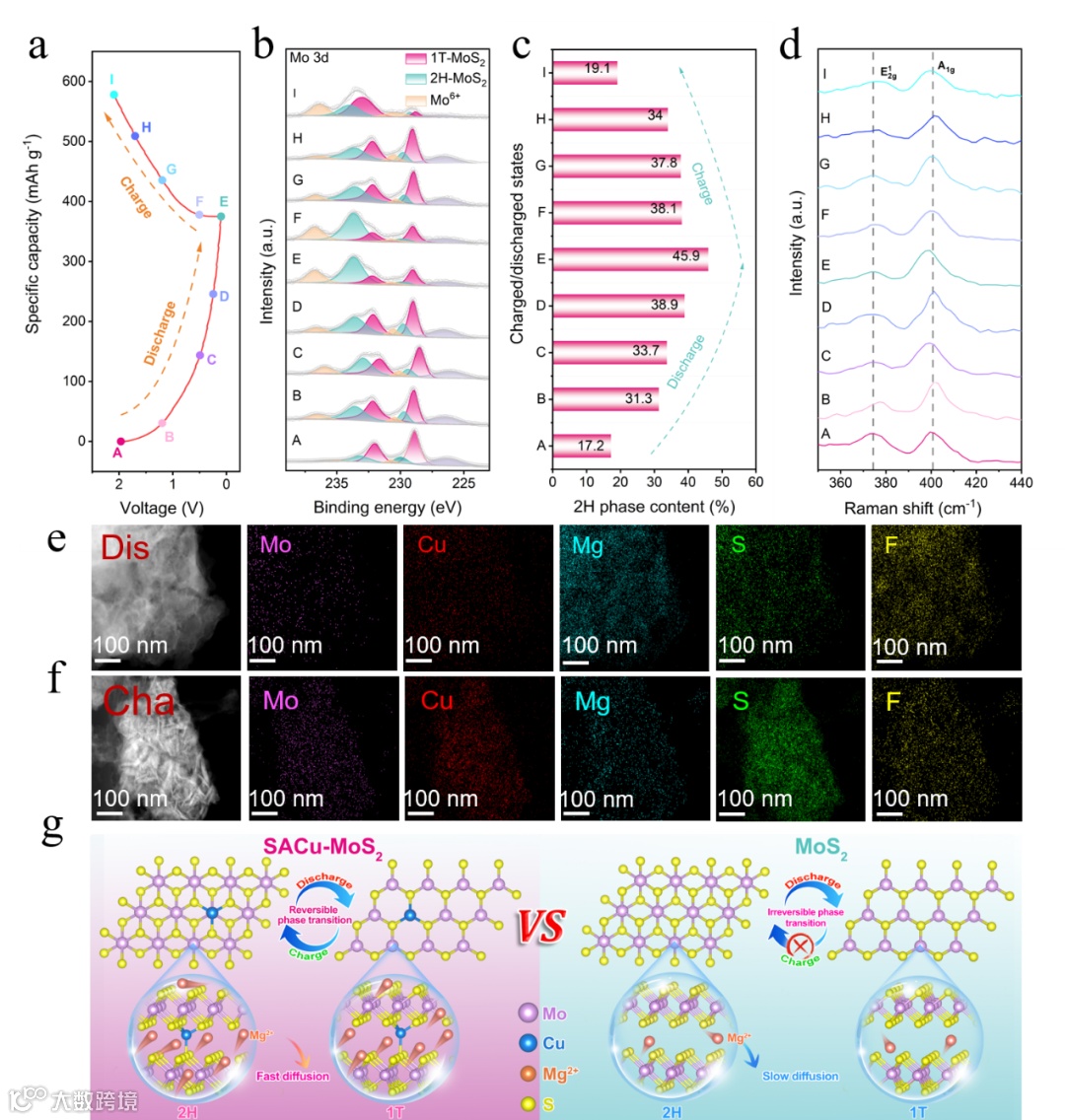 图 4(a)SACu-MoS2在20 mA g-1下的放电/充电曲线,图中标示的电压状态用于后续非原位表征;(b)SACu-MoS2在不同电压状态下的Mo 3d非原位XPS谱图;(c)在不同电压状态下的2H相含量变化;(d)SACu-MoS2在不同电压状态下的非原位Raman光谱;(e)、(f)SACu-MoS2电极在完全放电与充电状态下的元素分布图;(g)SACu-MoS2中Mg2+储存机制的示意图。
