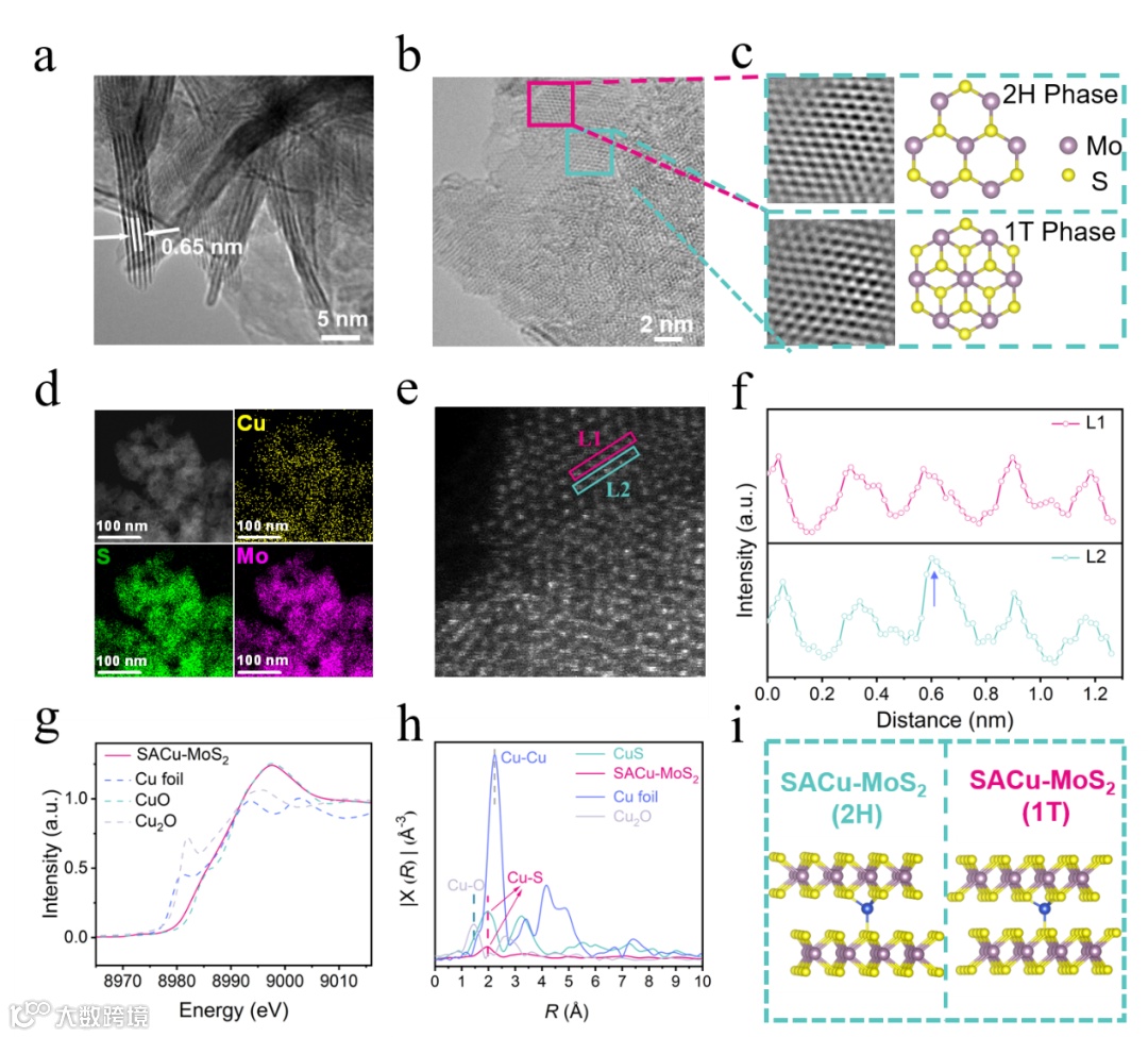 图 2(a–c)HRTEM图像;(d)SACu-MoS2的元素分布图;(e)SACu-MoS2的STEM–ADF图像;(f)沿(e)中两条相邻线(L1和L2)获取的强度剖面图;(g)SACu-MoS2的Cu K边XANES谱图;(h)SACu-MoS2的R空间EXAFS图;(i)SACu-MoS2中单原子Cu位置的示意图。