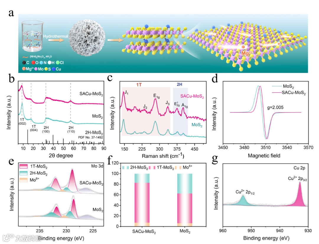 图 1(a)SACu-MoS2的制备示意图;(b)SACu-MoS2与MoS2的XRD图谱;(c)SACu-MoS2与MoS2的Rama光谱图;(d)SACu-MoS2与MoS2的EPR光谱;(e)SACu-MoS2与MoS2的Mo 3d XPS谱图;(f)SACu-MoS2与MoS2 2H相、1T相以及Mo6+含量比例的示意图;(g)SACu-MoS2的Cu 2p XPS谱图。