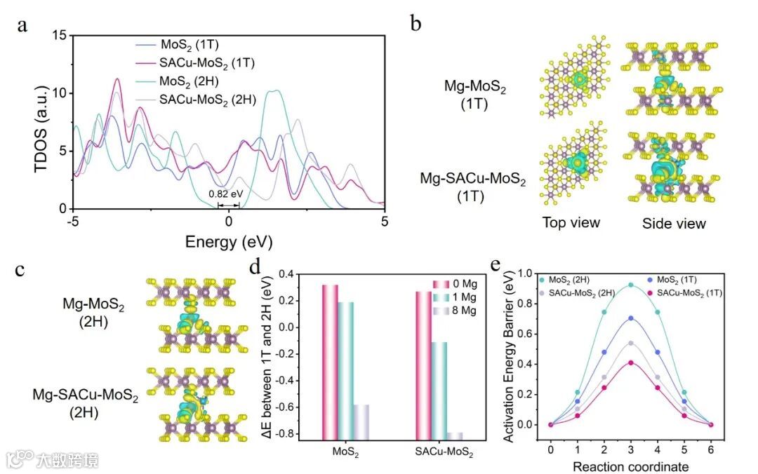 图 5(a)2H-MoS2、1T-MoS2以及SACu-MoS2的总态密度;(b)从侧视图和俯视图观察插入一个Mg2+后的1T-MoS2与SACu-MoS2的晶体结构及电荷密度差分图;(c)从侧视图观察插入一个Mg2+后的2H-MoS2与SACu-MoS2的晶体结构及电荷密度差分图;(d)在未插入、插入一个或八个Mg2+情况下,2H-MoS2、1T-MoS2与SACu-MoS2的能量差异;(e)Mg2+在MoS2与SACu-MoS2中的扩散能垒。