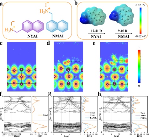 图1. a) NYAI 和 NMAI 的分子结构。b) NYAI 和 NMAI 的 ESP 和分子偶极矩。c) FAPbI3,d) FAPbI3/NYAI 和 e) FAPbI3/NMAI 的电子局域函数。f) FAPbI3,g) FAPbI3/NYAI 和 h) FAPbI3/NMAI 的电子能带结构和态密度(DOS)。