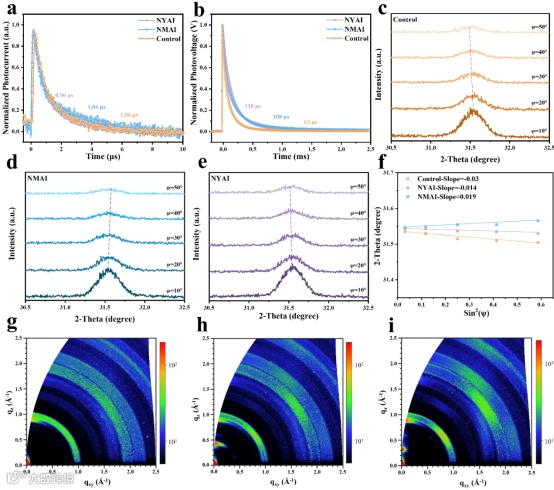 图4. a) TPC测试。b) TPV测试。c-e) GIXRD测试。f) 使用sin2ψ-2θ方法对GIXRD结果进行斜率拟合。g-i) GIWAXS测试。