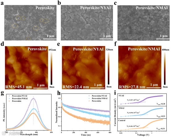图3. a-c) FESEM和d-f) AFM图像。g) 钙钛矿薄膜的PL光谱。h) 钙钛矿薄膜的TRPL光谱。i) 纯电子器件的 SCLC 测量。