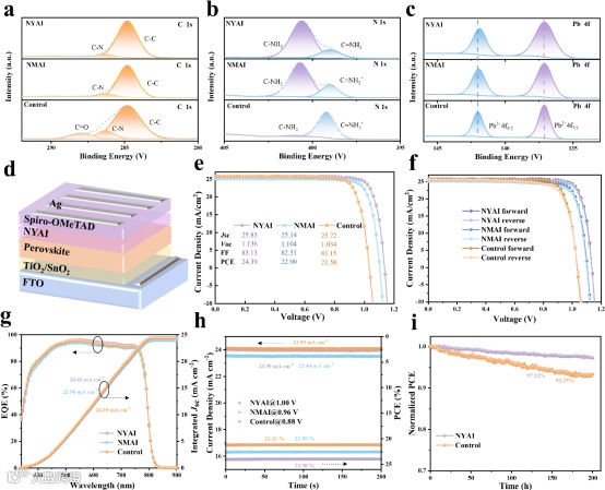 图5. a) C1s, b) N1s, c) Pb4f的XPS测试结果。d) NYAI处理的PSC器件结构。e) 基于Control、NYAI和NMAI的最佳器件的J-V曲线。f) 优化的NYAI处理、NMAI处理和控制装置在正向和反向扫描中的J-V曲线。g) EQE光谱。h) 在冠军器件的MPP下测量的光电流密度的稳态输出。i) 对照和 NYAI 处理的设备的光稳定性。