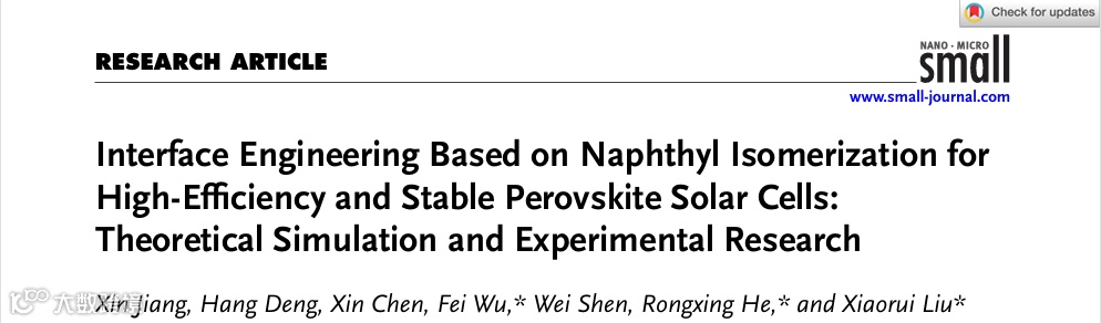 近日,来自西南大学化学与化工学院的刘小锐副教授、何荣幸教授与材料与能源学院的吴飞副教授合作,在国际知名期刊Small上发表题为“Interface Engineering Based on Naphthyl Isomerization for High-Efficiency and Stable Perovskite Solar Cells: Theoretical Simulation and Experimental Research”的研究论文。该工作提出了一种基于萘基异构化的策略,通过改变异构体的策略调整分子内电荷密度分布,以改善钙钛矿太阳能电池的界面缺陷。
