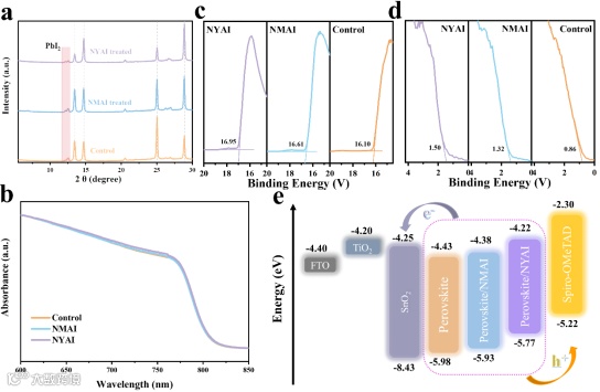 PSCs产生光生电流的先决条件是钙钛矿层与空穴传输层之间能级匹配良好。通过紫外光电子能谱(UPS)对钙钛矿/Spiro-OMeTAD的能级对齐情况进行研究。结果表明,对照、经NMAI处理以及经NYAI处理后的钙钛矿薄膜的价带最大值(VBM)分别为-5.98、-5.93和-5.77,其中经NYAI处理的钙钛矿薄膜VBM与空穴传输材料Spiro-OMeTAD的HOMO匹配更好,更有利于空穴的提取和传输。