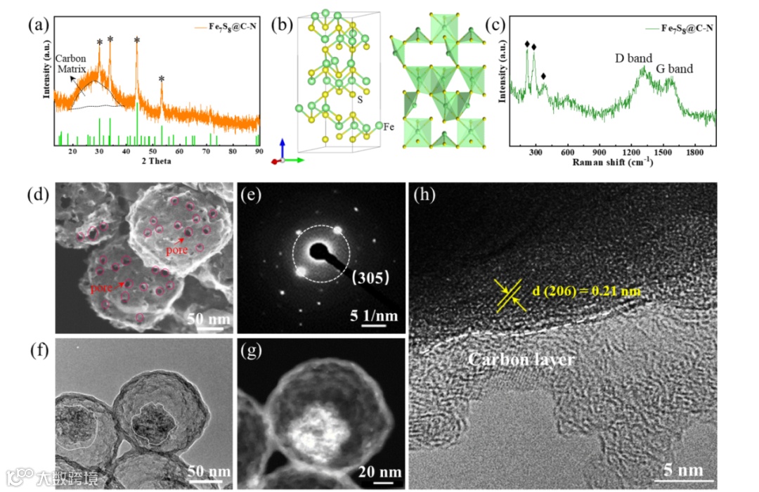 图2. 蛋黄壳结构Fe7S8@C-N材料的XRD、晶体结构、拉曼、TEM、HRTEM 图谱。
