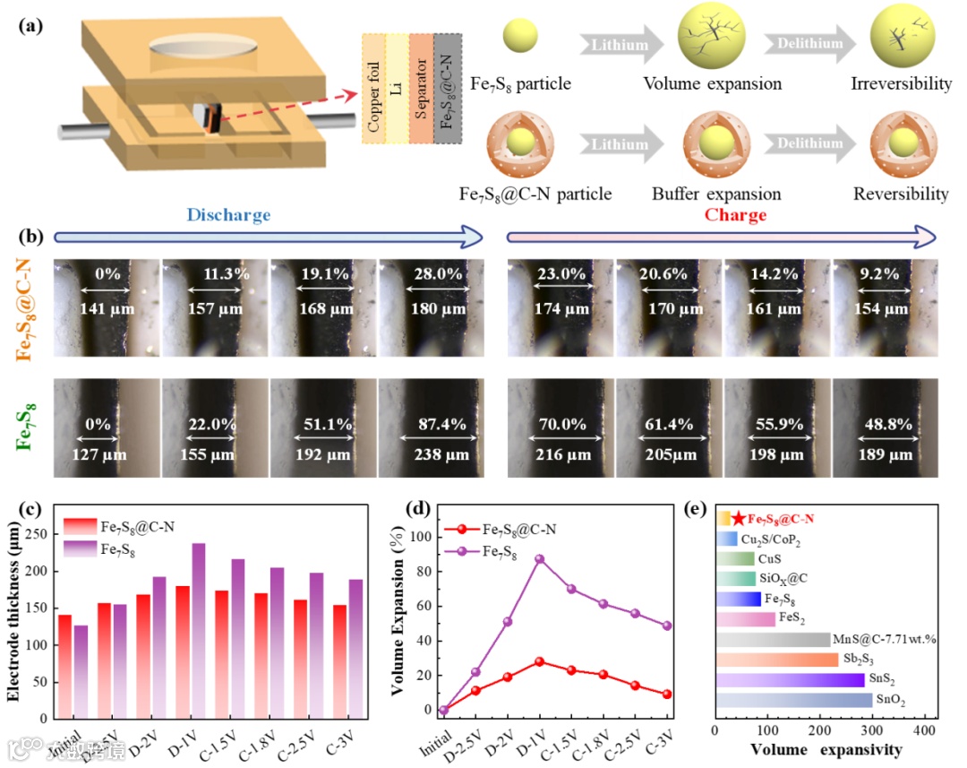 图3. Fe7S8@C-N与Fe7S8电极的(a)原位光学观测示意图、(b)原位光学图像、(c)截面厚度变化曲线、(d)电极体积膨胀率演化过程(e)及与其它负极材料的体积膨胀率对比分析。