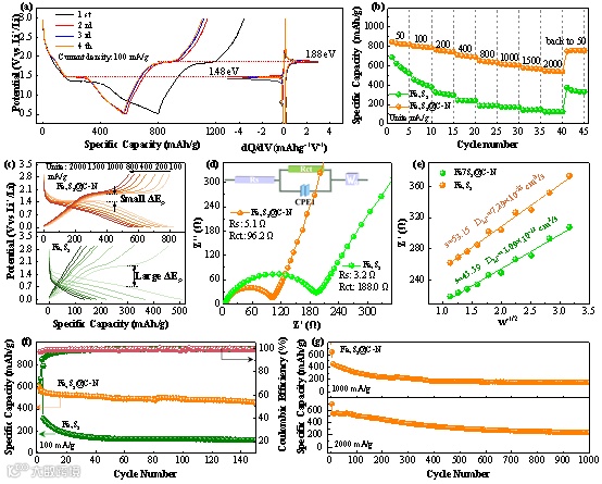 图4. Fe7S8@C-N与Fe7S8电极的(a)充放电曲线与微分容量(dQ/dV)曲线、(b)倍率性能、(c)不同电流密度充放电曲线、(d)电化学阻抗谱EIS测试、(e)锂离子扩散系数、(f)低电流密度(100 mA/g)长循环稳定性及(g)高电流密度(1000/2000 mA/g)循环性能对比。