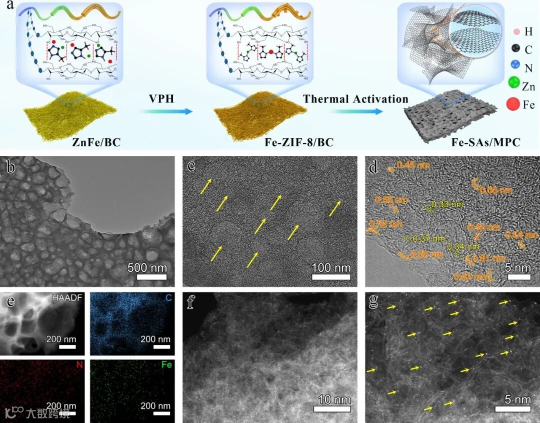 通过细菌纤维素前驱体制备的微孔硬碳(Fe-SAs/MPC)具有独特的褶皱石墨烯片层结构,形成亚纳米级受限微环境。这种结构不仅提高了单原子Fe位点的暴露度,还通过微孔内表面与反应中间体的氢键作用显著加速了氧还原反应(ORR)动力学。