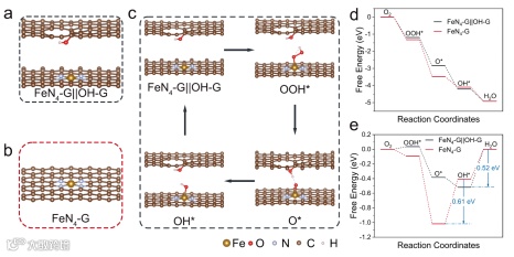 密度泛函理论(DFT)计算首次阐明,ORR反应中间体O*与微孔内表面之间的氢键相互作用大大促进了其质子化并加速了整体ORR动力学。(结合能提升0.633 eV),有效削弱了O*在 FeN4活性位点的吸附强度,使质子化步骤的能垒降低0.744 eV,从而将反应决速步骤的自由能变化从0.61 eV降至0.52 eV。