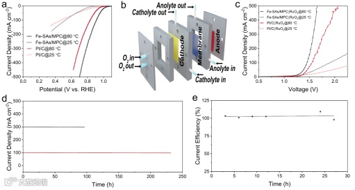 图3.(a)采用Fe-SAs/MPC和Pt/C的去极化氧阴极(ODC)在30% NaOH溶液于25 ℃和80 ℃下的ORR LSV曲线。(b)模拟工业氯碱工艺的双电极流动池示意图。(c) Fe-SAs/MPC‖RuO2和Pt/C‖RuO2双电极流动电池在25和80℃下的LSV曲线。(d) Fe-SAs/MPC‖RuO2流动电池的时间电流响应。(e) Fe-SAs/MPC‖RuO2的法拉第效率。