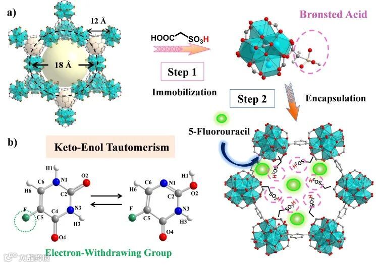 图1 a) FU@MOF-808-SO3H制备示意图;b) 5-氟尿嘧啶的酮式-烯醇式互变异构