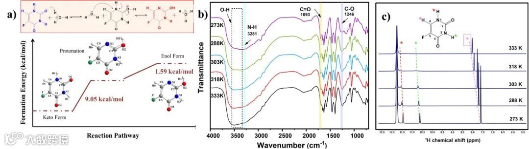 图2 a) 5-氟尿嘧啶的酸催化烯醇转变反应路径生成能;b) 原位傅里叶变换红外光谱;c) 变温核磁共振波谱研究