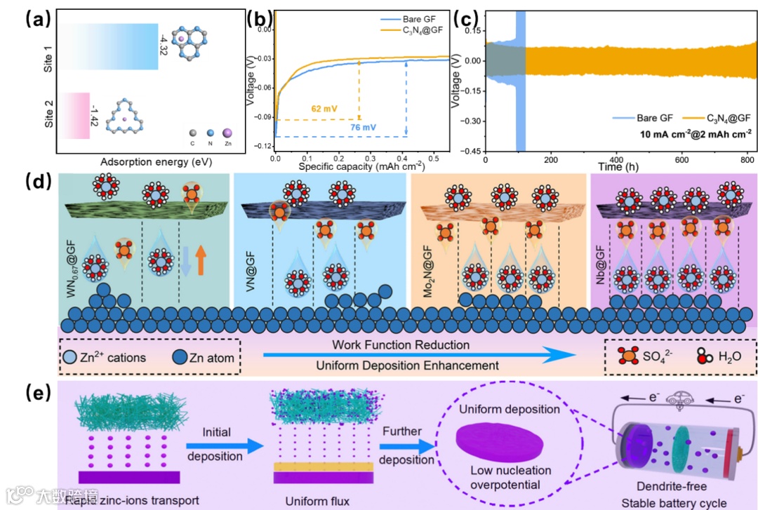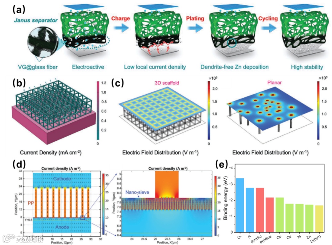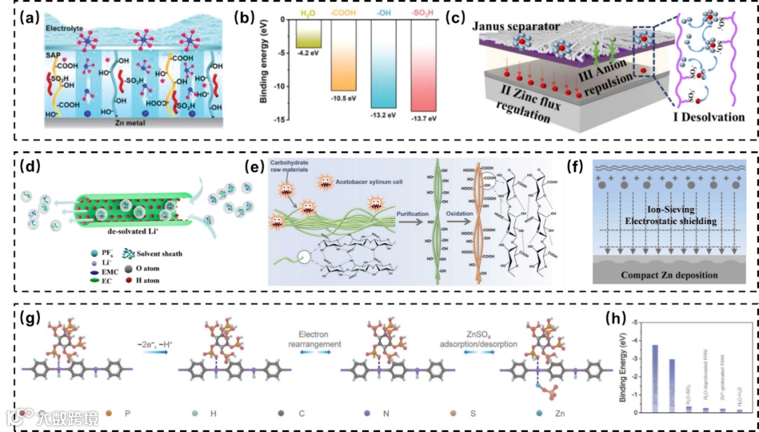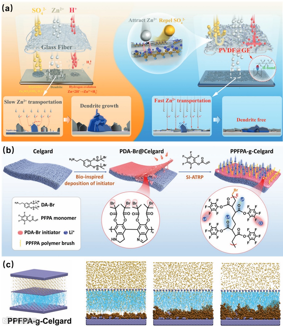电极-电解液界面的离子/电子传输行为直接影响二次金属电池的库伦效率、倍率性能与循环寿命,其中离子去溶剂化、传输、扩散及形核过程对负极沉积形貌起决定性作用。研究表明,界面电场与电流密度的分布可调控离子浓度与枝晶 “尖端效应”,因此隔膜表面功能化是优化界面行为的关键策略,具体包括以下方向:1)多功能官能团接枝:在隔膜表面接枝 - COOH、-OH、-SO₃H、-C=N 等官能团,可提升隔膜亲金属性(如亲锌性),实现离子分布与形核均匀化;接枝 C-F、P-F、N-F 等共价键则能促进负极表面形成致密稳定的 SEI 膜,抑制枝晶生长。2)亲金属材料修饰:金属颗粒(如 Mg、Ag、Nb、Au 等)可作为电沉积的非均相成核位点,引导形核分布;Zn、Sb、Sn、Al、Ag 等金属可通过合金化作用与负极形成稳定界面相,构建无枝晶结构。碳材料(如石墨烯、碳纳米纤维、碳纳米片)凭借高导电性与大比表面积,可均匀界面电场、减轻浓差极化与枝晶 “尖端效应”。氮化物(金属氮化物、无机氮化物)因强亲金属性,可调节离子通量并改善传输动力学。高分子材料(如 PVDF、PDA、PAN、PANI 等)与金属亲和力优异,既能作为物理屏障缓解枝晶与副反应的影响,又能增强隔膜耐久性。