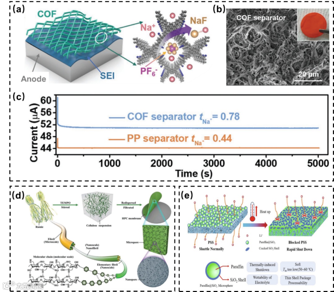 4)分级孔与响应孔集成:分级孔通过超分子工程整合隔膜内部多尺度孔道,可避免局部浓差极化、阻碍枝晶刺穿并引导离子定向迁移;响应孔则能基于外部环境(如 pH、温度)或刺激实现智能调控(如孔道的“开/闭”),例如热响应型孔依赖热敏感高分子微球,可在预设温度下熔融并阻断离子通道,防止电池热失控。