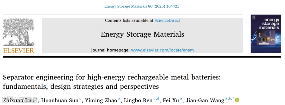 近日,来自西北工业大学的王建淦教授,在国际知名期刊Energy Storage Materials上发表题为“Separator engineering for high-energy rechargeable metal batteries: fundamentals, design strategies and perspectives”的综述文章。系统总结了高能二次金属电池隔膜的优化路径,提出孔结构调控、界面功能化及热力学性能增强三大设计策略,揭示了各策略的作用机理,并对高效实用化隔膜的未来设计进行了展望。