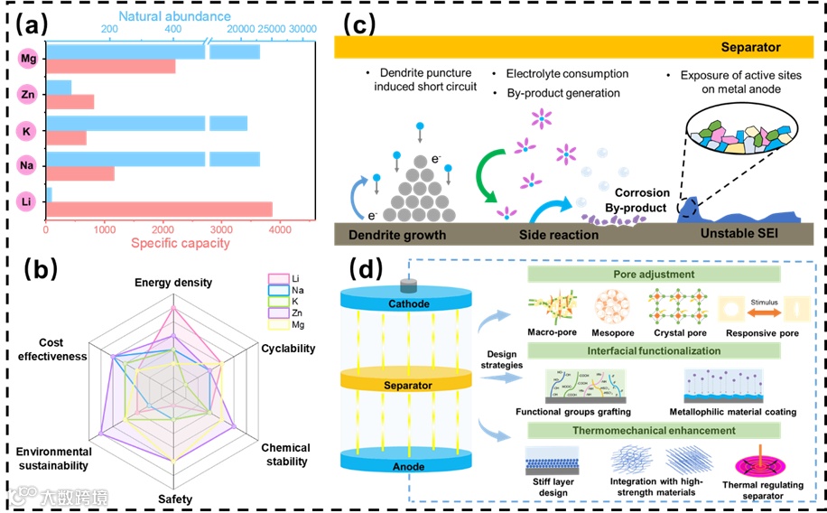二次金属电池(如 Li、Na、K、Zn、Mg 基电池)因负极具有极高的理论比容量,在下一代储能技术中展现出广阔应用前景。然而,金属负极表面易形成尖锐枝晶、发生不良副反应及生成不稳定固态电解质界面(SEI),这些问题显著劣化电池性能。近年来,隔膜改性作为一种简便高效的策略,被广泛用于缓解上述负极问题,成为研究热点。隔膜是电池的核心组件,其核心功能包括:阻隔正负极直接接触以避免短路、为离子迁移提供通道、存储电解液。商用隔膜多由聚丙烯(PP)、聚乙烯(PE)或玻璃纤维(GF)等材料制成,虽能满足现有二次电池体系的基本需求,但存在孔隙分布不均、机械强度不足、热传导失控及界面化学性能不佳等缺陷,严重制约电池的性能提升与安全保障。随着市场对高能量密度电池的需求攀升,隔膜的设计要求与策略愈发复杂且严苛。基于此,本文系统综述了多功能隔膜的基本设计准则,深入解析了多种优化策略的作用机制,并对未来隔膜设计方向进行了展望,旨在为解决金属负极挑战、推动二次金属电池发展提供理论参考与创新思路。