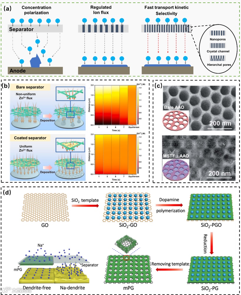 1)大孔孔径再分配:在商用隔膜表面修饰无机纳米颗粒(如 ZrO₂、石墨烯、BaTiO₃、氧化石墨烯、SiO₂纳米片等),可有效降低孔隙诱导的离子传输不均所致浓差极化,显著提升金属负极沉积均匀性。