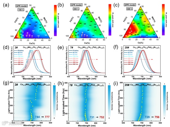 本研究构建了结合拉丁超立方采样(LHS)与高斯过程回归(GPR)的高通量筛选框架,系统探索A位(FA/Cs/MA)与X位(Br/I)比例对混合卤素钙钛矿的光致相分离现象的影响。通过分析25种不同组分的老化荧光峰位移动数据,绘制出稳定性三元图,成功筛选出相稳定性较好的组分区域,明确了A位阳离子对混合卤素钙钛矿相分离的影响趋势,并建立了机器学习模型,其适用于叠层电池设计时钙钛矿的组分选择。