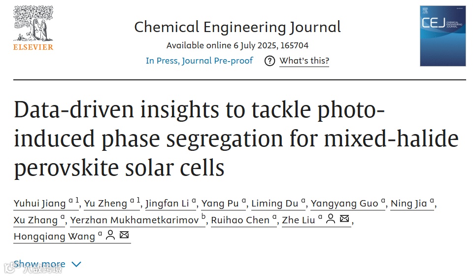 近日,西北工业大学王洪强教授、刘哲教授在国际知名期刊Chemical Engineering Journal上发表题为“Data-driven insights to tackle photo-induced phase segregation for mixed-halide perovskite solar cells”的研究文章。该研究采用数据驱动方法,系统优化混合卤化物宽带隙钙钛矿的组成与界面结构。通过LHS与GPR模型筛选出稳定性优异的钙钛矿组分Cs0.24MA0.02FA0.74Pb(I0.76Br0.24)3,并引入混合自组装单分子层(SAMs)提升结晶质量与界面黏附性。构建的p-i-n器件实现21.18%效率,1000小时光照后仍保留85%初始性能。本文所采集的数据、模型和研究方法可在叠层电池设计中钙钛矿组分和界面层的选择提供有效支撑。