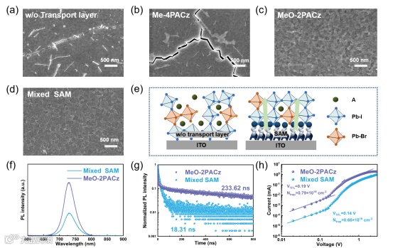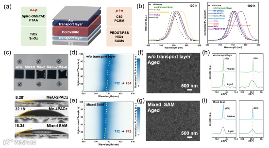 针对电荷传输层对器件稳定性的影响,系统研究12种上下界面材料,阐明了界面层在钙钛矿结晶质量、相分离和界面缺陷多元因素的共同影响机制,明确了混合自组装单分子层(MeO-2PACz 与 Me-4PACz)提升相稳定性的优势。XPS、UPS与剥离界面SEM图像揭示混合SAMs能增强钙钛矿与底电极之间的结合强度,诱导优质晶体生长,进而提升整体界面质量和载流子提取能力。