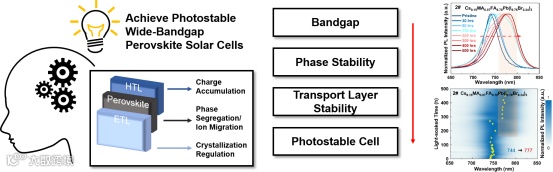 近年来,钙钛矿叠层太阳能电池因其持续攀升的光电转换效率(PCE)而备受瞩目。然而,混合卤素宽带隙钙钛矿在光照条件下易发生相分离现象(富碘、富溴相),严重影响其光稳定性,进一步限制叠层电池的商业化。为抑制这一现象,研究者们尝试通过组分优化(尤其是A位阳离子与X位卤素共优化)以及界面修饰(减少载流子堆积与界面缺陷)等手段进行调控。然而,由于合成方法、实验条件和配比差异,当前文献中关于材料稳定性与性能的比较性不足。因此,建立一套高通量的筛选方法系统性研究钙钛矿组分和界面层对相分离的影响。为此,本研究采用数据驱动的方法,结合拉丁超立方采样(LHS)与高斯过程回归(GPR)机器学习模型,系统评估了A位(FA/Cs/MA)与X位(Br/I)配比对光致相分离现象的影响。通过建立大规模光照老化数据库,识别出一组最优配比的宽带隙钙钛Cs0.24MA0.02FA0.74Pb(I0.76Br0.24)3,带隙约为1.69 eV,并在此基础上进一步筛选了12种电荷传输层材料。结果发现,自组装单分子层(SAMs),特别是混合使用MeO-2PACz与Me-4PACz,不仅改善了钙钛矿的结晶质量和其与界面的粘附性,还显著抑制了相分离。在未引入其他钝化分子的前提下,最终器件的PCE达到21.18%,且在1000小时光照下仍保留85%以上初始效率,显示出优异的稳定性。
