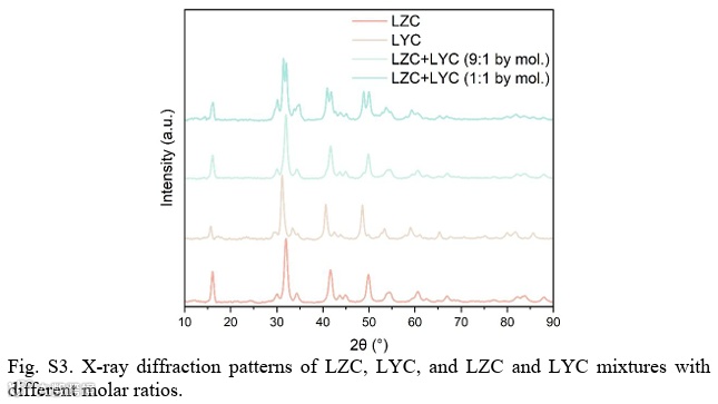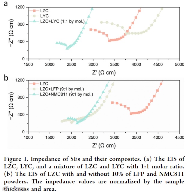 该策略还可扩展到固体电解质与其他无机组分混合以提高其离子电导率。图1b显示,将10%摩尔比的NMC811与LZC 混合可将其离子电导率从0.30mS cm–1提高到0.47 mS cm–1,将 10%摩尔比的LFP混合到LZC 中可进一步将其离子电导率提高到 0.50 mS cm–1。图S4显示NMC811和LFP与LZC的简单物理混合不会产生新的产物,因此增加的离子电导率也应该来自在LZC界面处形成的空间电荷层。因此,该策略不仅可用于设计固体电解质,还可用于设计用于大功率应用的复合正极。