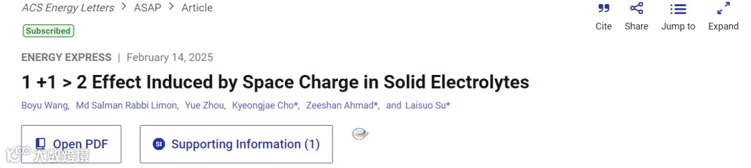 近日,来自UT Dallas的苏来锁、Kyeongjae Cho教授与德克萨斯理工大学的Zeeshan Ahmad教授合作,在国际知名期刊ACS Energy Letters上发表题为“1 +1 > 2 Effect Induced by Space Charge in Solid Electrolytes”的能源快讯论文。通过简单将两种固体电解质材料简单混合就可以获得相比单一固体电解质材料更高的离子电导率,这一发现为提高固体电解质材料的离子电导率提供了一种新的策略。