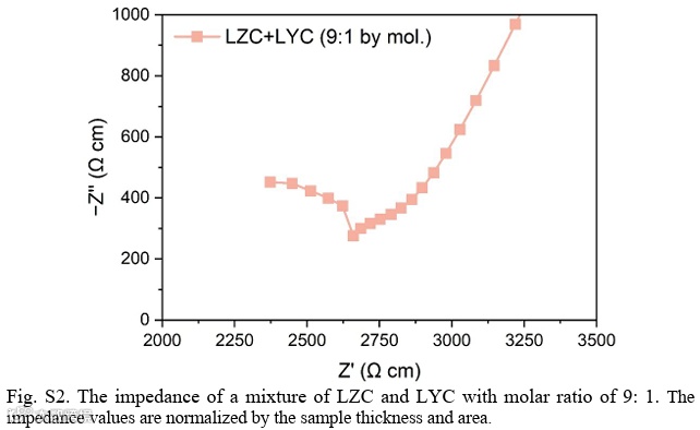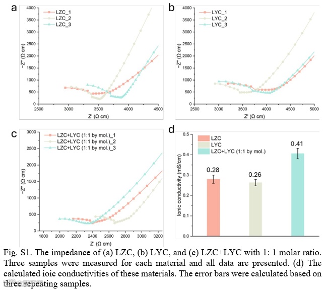 图 1a显示,以 1:1 的摩尔比混合 Li2ZrCl6 (LZC)和Li3YCl6 (LYC)的复合材料具有比 LZC和LYC本身小得多的阻抗。对每种材料测量了三个重复样品。计算出的复合材料的离子电导率从0.28±0.02 mS cm–1(LZC)和0.26±0.02 mS cm–1(LYC)增加到 0.41±0.03 mS cm–1。同样,摩尔比为9:1的复合材料(LZC:LYC)也将离子电导率提高到 0.38 mS cm–1(图S2)。图S3比较了LZC、LYC 和1:1混合复合材料的 X 射线衍射 (XRD)。结果表明,LZC和LYC的简单物理混合不会产生新的产物。因此,复合材料中离子电导率的提高应归因于复合材料中的不同界面。