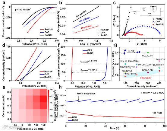 图2. (a) Ru/CoP、CoP和Ru/NC 的LSV曲线. (b) Ru/CoP、CoP和Ru/NC的Tafel斜率. (c) Ru/CoP、CoP和Ru/NC的EIS图. (d) Ru/CoP、CoP和Ru/NC的LSV曲线. (e) Ru/CoP的电流密度随1 M KOH中不同N2H4浓度的变化. (f) OER和HzOR的Ru/CoP的LSV曲线。(g) 各种电催化剂的活性比较。(h) HER和HzOR的稳定性评估.