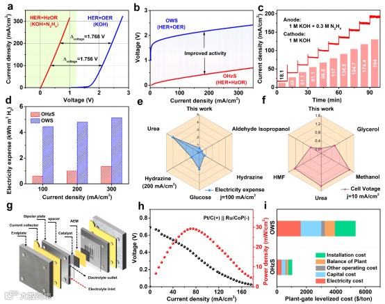 图5. (a) 在具有和不具有N2H4的1 M KOH中在H型电解槽中测试的水分解的LSV曲线. (b) OWS和OHzS系统的LSV曲线. (c) OHzS系统在不同槽电压下的I-t曲线. (d) OWS和OHzS系统在不同电流密度下的电力消耗比较. 小分子辅助水分解在(e) 电力消耗和(f) 电池电压的比较. (g) DHzFC示意图. (h) DHzFC的放电极化曲线和功率密度图. (i) OWS和OHzS系统的TEA分析.