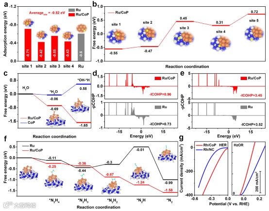 图四. (a) 在Ru/CoP和块体Ru中Ru位点上*H的吸附能. (b) Ru/CoP上氢溢流的自由能. (c) Ru/CoP和CoP上H2O吸附和解离能垒. (d) Ru/CoP和块体Ru中N2H4和Ru之间的COHP. (e) Ru/CoP和块体Ru中*N2H3和Ru之间的COHP. (f) HzOR过程中Ru和Ru/CoP的自由能。(g) Rh/CoP和Rh/NC的LSV曲线(HER和HzOR).