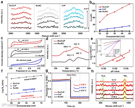 图3. (a) 在1 M KOH中Ru/CoP、CoP和Ru/NC的原位拉曼光谱. (b) Ru/CoP、CoP和Ru/NC的不同过电位下的Cφ值. (c) Ru/CoP、CoP和Ru/NC的CV曲线. (d) Ru/CoP和Ru/NC的H2-TPD曲线. (e) Ru/CoP的Log |j|作为pH值的函数. (f) 从Log R2得出的Ru/CoP、CoP和Ru/NC对超电势的Tafel图. (g)注入N2H4前后Ru/CoP、CoP和Ru/NC的OCP变化. (h)在1 M KOH +0.03 M N2H4中Ru/CoP的原位拉曼光谱.