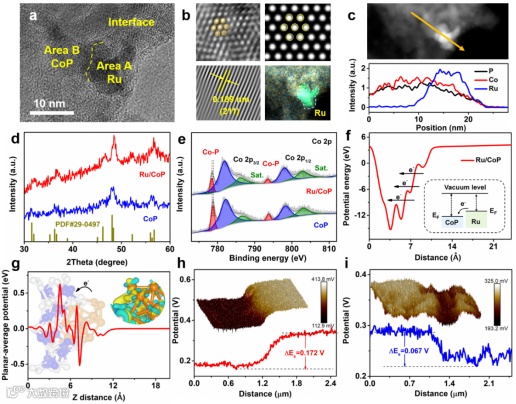 图1. (a) Ru/CoP的HRTEM图像. (b) 顶部: 区域A中的HRTEM和模拟图像,底部:区域B中FFT图像以及Ru、Co和P的EDS图像(蓝色、橙色和绿色分别代表P、Co和Ru). (c)沿着异质界面处的橙色箭头进行线扫描. (d) Ru/CoP和CoP的XRD图谱. (e) Ru/CoP和CoP的Co 2p XPS能谱. (f) Ru/CoP沿z方向的静电势. (g) Ru/CoP的平面平均电位。 (h) Ru/CoP和(i) CoP的KPFM图像.