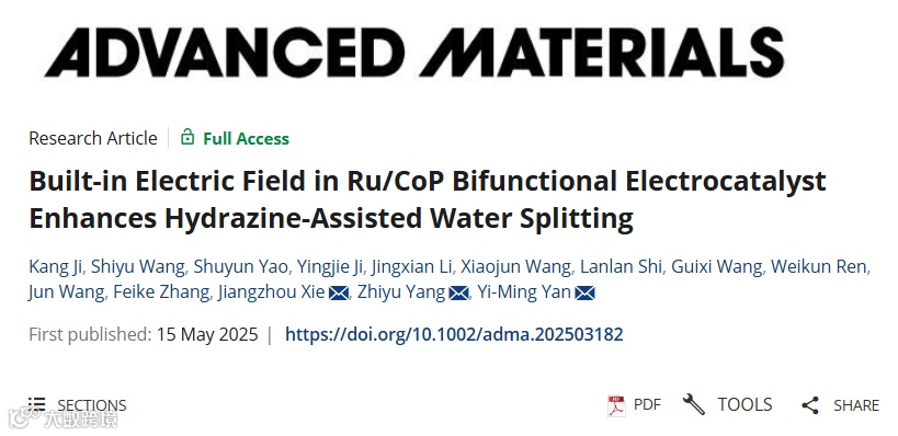 基于此,来自北京化工大学的严乙铭教授课题组,在国际知名期刊Advanced Materials上发表题为“Built-in Electric Field in Ru/CoP Bifunctional Electrocatalyst Enhances Hydrazine-Assisted Water Splitting”的研究文章。该工作开发了Ru/CoP异质结构双功能电催化剂,通过在Ru纳米颗粒与CoP纳米片间构筑内建电场,促进界面电子转移,优化*H和N2H4的吸附行为。实验表明,该结构通过削弱Ru上*H的强吸附并促进氢溢流至CoP,提升HER活性;同时增强 N2H4吸附及脱氢过程,优化HzOR性能。与传统水分解相比,Ru/CoP在肼辅助水分解体系中显著降低电压和能耗,且具有良好的稳定性。密度泛函理论(DFT)计算验证了界面电子调控的机制,为设计高效异质结构催化剂提供了新策略。