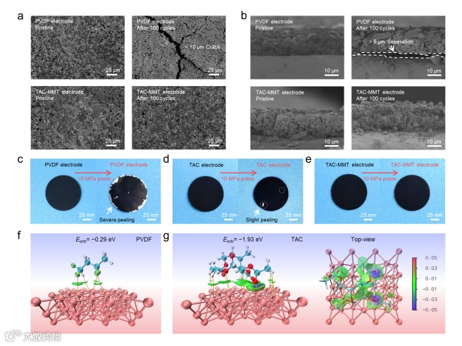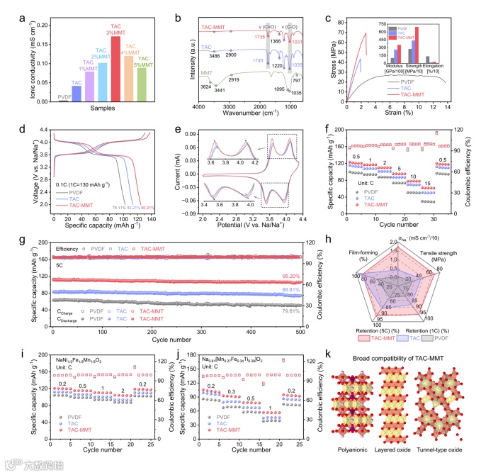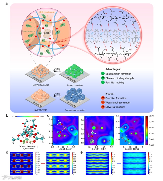 在这项研究中,设计了一种由三醋酸纤维素和天然蒙脱土交联组成的通用三醋酸纤维素基粘结剂(TAC-MMT),以促进钠离子的快速传输途径并建立强大的氢键网络。这种创新的TAC-MMT粘结剂具有独特的化学结构,通过自富集和快速传输机制实现了高离子电导率,而其优异的结合强度归因于三醋酸纤维素中的质子受体(C=O)和蒙脱土中的质子供体(-OH)之间的氢键交联。更重要的是,TAC-MMT出色的溶解性和成膜性能有助于稳定的电极保护和与高压钠离子电池阴极的广泛兼容性。得益于这些优势,采用TAC-MMT粘结剂的Na3V2(PO4)2O2F电极表现出卓越的性能,包括在5C下500次循环的高容量保持率为95.2%,以及高达15C的快速速率响应。TAC-MMT粘结剂的多功能性在高压NaNi1/3Fe1/3Mn1/3O2和Na0.61[Mn2.7Fe0.34Ti0.39]O2阴极上得到了进一步证实。本研究强调了生物质基粘结剂作为推进高性能钠离子电池的可持续和有效解决方案的潜力。