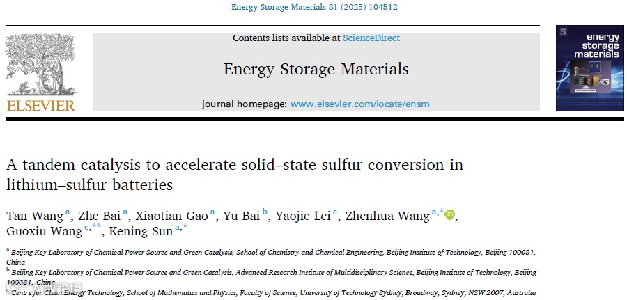 近日,来自北京理工大学的王振华教授、孙克宁教授团队联合悉尼科技大学的汪国秀教授,在国际知名期刊Energy Storage Materials上发表题为“ A tandem catalysis to accelerate solid–state sulfur conversion in lithium–sulfur batteries”的研究文章。该文章首次报道了具有双活性位点的不对称Ta-N5单原子催化剂(Ta-SAs/NC),其设计旨在触发串联催化,从而促进LiPS的逐步转化。这种不对称的Ta-N5配位环境诱导电子重新分布,从而增强Ta 5d和S 3p轨道之间的d-p杂化。在这种串联催化过程中,Ta-S键主要加速LiPS的液固转化,而N5-Li(N5代表Ta-SAs/NC中的第五个N原子)键则是后续固固转化的主要活性位点。当应用在锂硫电池时,电池表现出卓越的循环稳定性和倍率性能。在7C高电流密度下循环500次,电池仍具有90.42%的高容量保持率。