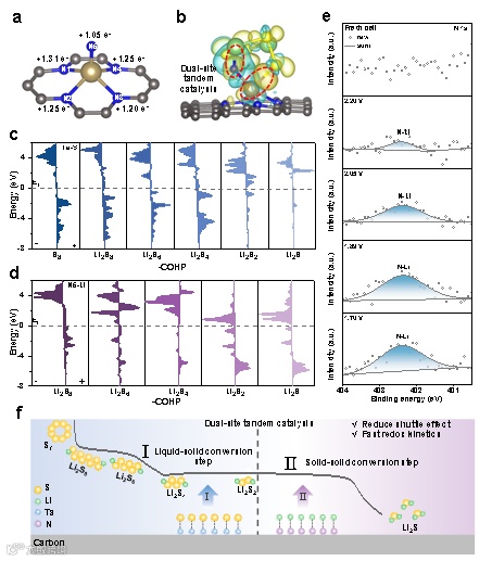 通过DFT计算,发现S8到Li2S4的过程中,键合状态仅出现在Ef以下,表明Ta-S键主要加速了液固转化步骤。在Li2S2和Li2S的吸附过程中,键合轨道逐渐移动到Ef以上,峰宽变窄,表明Ta-S键合逐渐减弱。在固-固转换阶段,主要的键合贡献来自N5-Li键,其增强的耦合有助于LiPS的进一步转换。此外,通过在不同放电电位下对Ta-SAs/NC中间层进行非原位XPS分析,进一步研究反应机理。其多步电子转移过程可分为两个主要步骤:(I)从Li2S8到Li2S2的液固转化,(II)从Li2S2到Li2S的固固转化。其中,Ta-S键在液固转化过程中起着关键作用,促进了LiPS的还原反应,而N5-Li键在固固转换过程中起到了决定性作用,加速了Li2S的生成。这种双位点串联催化机制进一步增强了LiPS的氧化还原反应动力学。