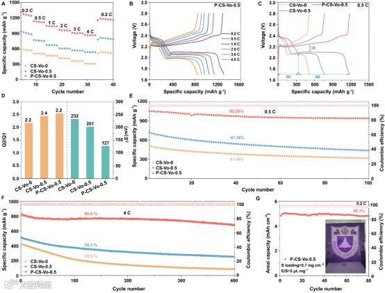 图6. (A) 不同电流速率下的速率能力(B) P-CS-Vo-0.5的GCD曲线;(C) 0.5C下各电极的GCD曲线,(D)对应的Q2/Q1和ΔE值;(E-F)在0.5 C和4 C下的长期循环性能和(G)在高S负载下的容量保持率,插图显示了由具有P-CS-Vo-0.5隔板的Li-S电池供电的LED的图片。