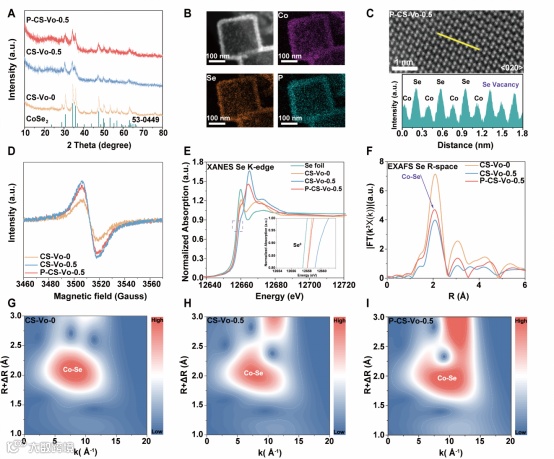 图2. (A) XRD图谱;(B) P-CS-Vo-0.5的STEM-HADDF图和相对应的mapping图;(C) AC-HADDF-STEM图和从黄线获取的行扫描强度剖面图;(D) EPR图;(E-F) Se K-edge XANES光谱和相应的FT-EXAFS光谱;(G-I) CS-Vo-0、CS-Vo-0.5、P-CS-Vo-0.5的Se - k边缘的小波变换等值线图。