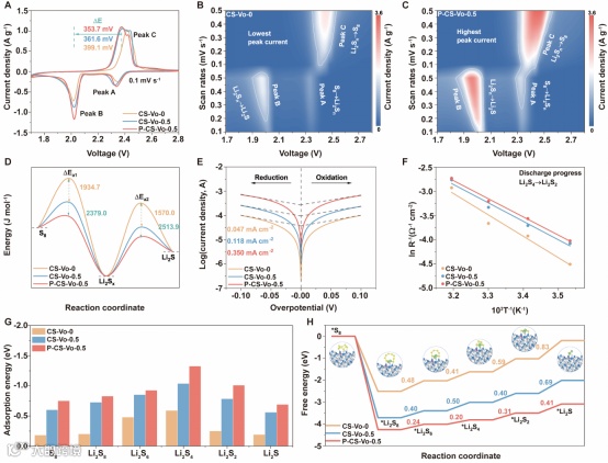 图4. (A) CV曲线;(B) CS-Vo-0和(c) P-CS-Vo-0.5在不同扫描速率下的CV等值线图;(D)两种硫阴极的相对活化能;(E)塔菲尔曲线;(F)绝对温度的倒数(T)与电荷转移电阻倒数的对数之间的线性关系;(G)计算的硫吸附能,(H)相对自由能。