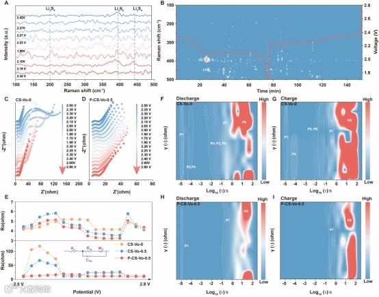 图5. (A-B) 使用P-CS-Vo-0.5隔膜在不同电压下电池放电/充电过程中的原位拉曼光谱及相应拉曼曲线;(C-D)使用CS-Vo-0和P-CS-Vo-0.5隔膜的电池在0.2C时的Nyquist图,(E)不同放电和充电深度下Ro、Rs的拟合结果。根据(F-G)CS-Vo-0和(H-I)P-CS-Vo-0.5不同电压下的EIS测量结果计算DRT等高线图。