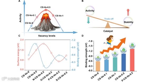 图1. (A)空位水平与催化活性的关系;(B)催化剂活性与稳定性的跷跷板关系;(C) N-CS-Vo-0.5、S-CS-Vo-0.5、O-CS-Vo-0.5、P-CS-Vo-0.5与Li2S4的结合能和表面能;(D) Li2S4在催化剂上的吸附能和差电荷密度